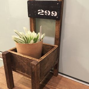 多肉好きのお友達へのプレゼントに チェア型の多肉鉢を作りました♡ 私のGSネームの299をステンシルしてみました(*´艸`*) (大好きな多肉とワンコをかけてニクキュウ299です。) これにもりもりの寄せ植えしたとこみたいな〜(≧∇≦) なので自分用にも作ろうとおもいます♡