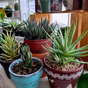 ディッキア ブレビフォリア ムーングロー ハオルシア ルリ殿錦 缶と陶器を鉢カバーにしました。