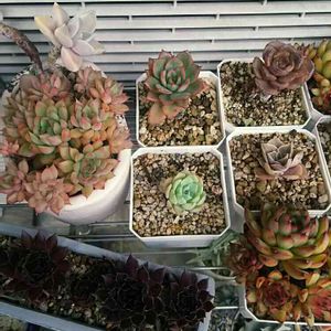 里子予定の多肉⑤ 【エケベリア】女雛(群生)、養老1個、ロスラリス1個、名無し(右上とその隣)各1個 【センペルビウム】ブランプローズ 女雛って、どうしてこんなに増えるんだろうね? 怖すぎて鉢増し止めちゃったよ😅 名無し達は木立ちしてるよ😃 何回もカットして仕立て直すけど、直ぐ木立ちになるからそのまま~(^w^)