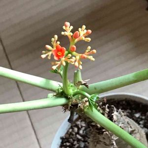 とげなしハナキリン咲きました。 個人的感想で室内のみだと花芽つかないと感じます。GWからずっと西日の当たる外に置いてやっと今開花です。