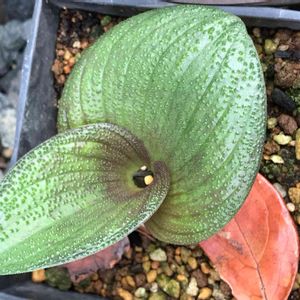 マッソニア 知らない間に葉が出てました。 室内入れると具合悪くなるんで、早く開花して落葉してシーズン終わって欲しい…