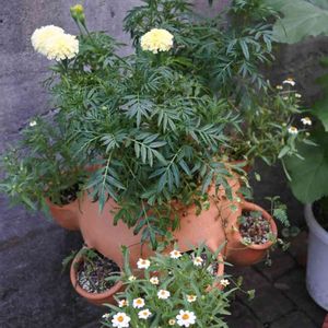 ストロベリーポットに植えたアフリカンマリーゴールドとジニア・リネアリスがようやく咲き揃いました。暑いけど、頑張って!