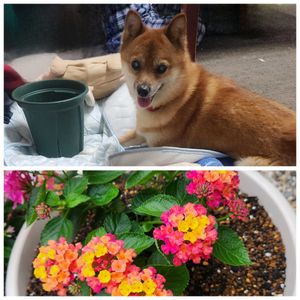 【上】わんこ🐕️と、緑7号鉢 【下】スーパーランタナ トロピカル サンセット10号浅鉢に鉢増ししました。 1️⃣スーパーランタナなどの植え替えや、切り戻しに熱中している間に…わんこ🐕️が、緑7号鉢を庭からくわえて略奪❗➡居間でガリガリしてました~😆