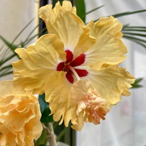 🌈イエローフラミンゴ🌈 連休明け 一日中雨の昨日 肌寒くて 今日朝も風やや冷たい お日様カンカンの日は暑いぐらい🫠 お天気悪いと 寒い。。。 体がついていかへん💦💦💦 毎日のど痛🥹🥹なシンバです。 1枚目pic イエローフラミンゴ 今日も一つ開花🎉🎉 ハイビスカスカウント ➕I🟰25💖 2枚目pic ミニ胡蝶蘭(花終わり半額やった方) 白いお花が咲いてきました。🎉🎉 3枚目pic 年明けからのお野菜の高値で🥹🥹 今年は 自家製お野菜色々挑戦😁 きゅうり🥒 花が咲いてきました。 この花元がきゅうり🥒に成長するはずよね。。。 けど 最近 スーパーで きゅうりめちゃ安なってきたやん。。🤣🤣 おまけpic🐾 オジィのお昼寝姿 伸びに伸びたヘッドヘヤー💦💦 インスタントラーメンの様な毛質のオジィ ドラッドヘアーのお兄ちゃん😆