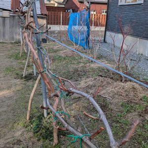 ずっと考えてたブドウの垣根仕立てを修正、改善しました。 支柱がしなってるのを支え杭打ち、ワイヤーを2本にして、アンカーを入れ直し。なんとか考えたように改善できた。あとは雨除けにトンネル支柱をたてるんだけど石だらけ&根があちこちにあるからうまくいくかどうか😥 今年こそ自家製の🍇食べたい💦