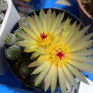 2年前ホームセンターの隅っこで見切り品として200円で売られていた3cmぐらいの大きさの金小町🌵 立派に大きくなり初開花🌼 キラキラして透けるような花びらでとても綺麗です🎶