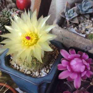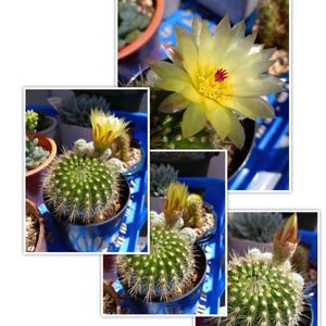 今年は今までに無く黄花のサボテンがたくさん咲きました🌼 一番図体が大きいワラシーは、我が家では初開花です。レモンイエローの丸弁でした。なんて可憐な! 黄花勢で集合写真を撮ろうと待っていたら金小町はサッサと咲き終えていました。