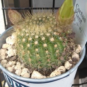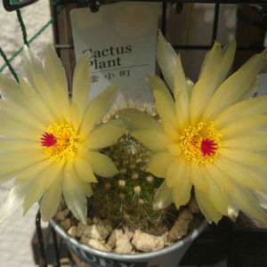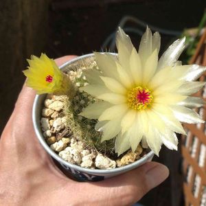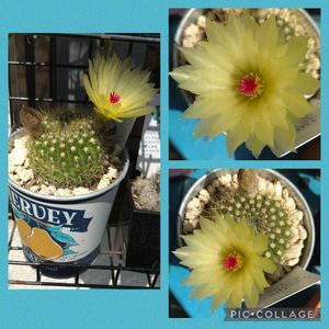 金小町さん。サボテンは沢山種類があるのでわかりませんが購入時の名前です。7cm位のチビッ子が年中、雨ざらし、ガンガンお日様で二年目。15cmになりました。初めてお花を見せてくれました❤️お花の中にお花?とってもキレイ。今年植え替えてみたので機嫌良くなってくれたかな。ありがとう❤️