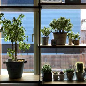 室内の出窓にはベンジャミンや、寒さに弱い子達や小さいエケベリア、サボテンを集めて並べる♪ おぉ、なんか窓辺が広いっ( *´艸`)