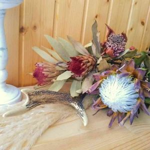 鹿の角スワッグ束ねました🦌 プロテアレッドレックス プロテアロビン テロペア パンパスグラス プロテアレッドレックスは10/29に投稿したのがドライフラワーになったものです💯 鹿の角とワイルドフラワー! 雰囲気合うー❇️👍😁