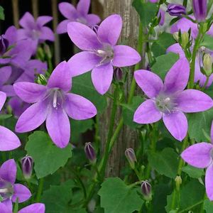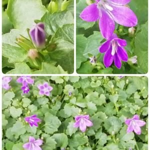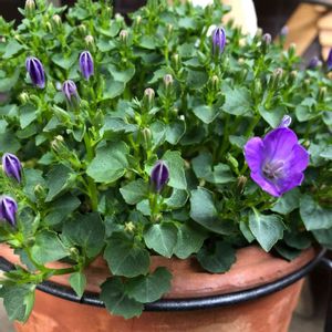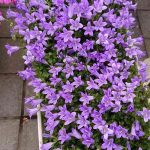 ~ベルフラワー~ 乙女桔梗 耐寒性宿根草で、一年中葉は落ちません。 もう10年以上毎年咲いてくれるベルフラワー🔔 たくさんの蕾が付き、太陽に向かってお花が咲き始めました♡ 小さな紫色のお花が一斉に咲くと、 それはそれはお見事です✨ 一番大きな鉢は約40cm 。 株分けして一回り大きな鉢に植えると、翌年には鉢いっぱいになります🤗