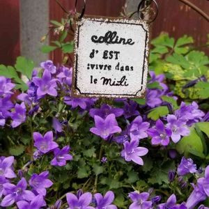 「魔女の宅急便🧙♀️」のキキの鉢にスミレに変わってベルフラワーが咲き始めました。 キキもジジも元気です。 焼き立ての美味しいパンを🍞🥐🥖🥪キキがお届けしますよ〜
