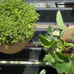 いちご植え替えました🍓なるかなあ?😊左側はベルフラワーだとおもうんですが、確定判断は花を待ちます😰