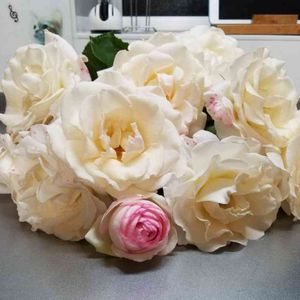 キッチンの流しから失礼します💦 明日から雨☔ 開いた薔薇をカットしました✂️ さすがhybrid tea rose🌹デカっ😲 手入れ中に折ってしまった ピエールドゥロンサールを添えて😁