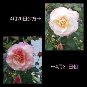 アブラカダブラ 今日は3つも開いてました🌹 此処だけが華やかになってます😅 上段がAM6時位に撮ったもので 下段が4時間後位に撮ったものです。見るたびに変化があって楽しませてくれます💕