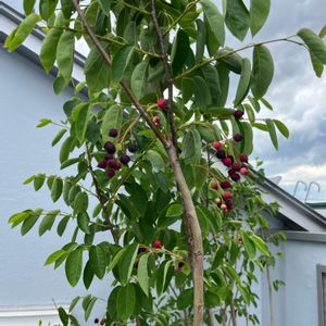 収穫! ジューンベリー🍒 今年の春に迎えた、背丈約170cm株立ちの苗木 先週末に、長男、次男が大盛り上がりで初収穫していました! 鳥さんたちにもバレておらず、被害も無し◎ まだまだ採れそうです♪ ちょうどバックにキレイな青空が入りました📸