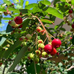 ジューンベリーの赤い実🍒 孫が甘くて美味しいと言って 食べるのだそうです。😋💕 ほんとかな🤔 バラ科ザイフリボク属落葉小高木