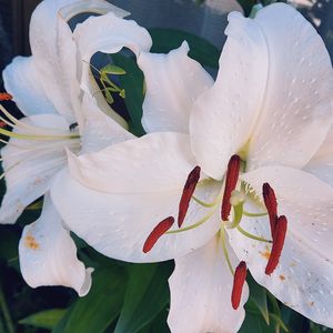 カサブランカの花びらに 映っている影の正体は? カマキリの赤ちゃんです。