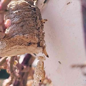 カマキリの赤ちゃんが あちこち歩いてるから卵をじっくり見てみたら 出てきてた〜(๑ÖㅁÖ๑)✨ ベビーサンローズの茎が邪魔で ✂切って写真撮った😅 まさに出て来てる瞬間🎶 生まれて初めて見る〰️💗💗💗 何匹くらい出てくるのかな〜⁉️ 続々と出てくる子達、 このまま放っとけばいいのかな? 先に出てきてる子は 簡易ビニールハウスの中で 多肉の上を歩き回ってるんだけどね🎶 自然に任せとけばイイかなぁ〜🎶