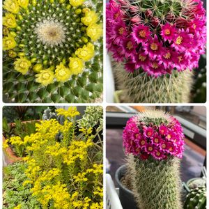①金洋丸の子株にも花💛 ②ストライプの桃花丸の花🩷 ③長ーーーい棘が見切れている玉翁💕 ④下の方から咲く宝山❤️