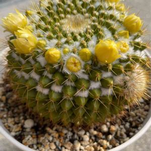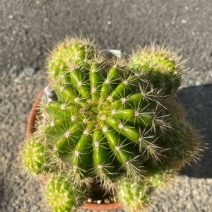 「金洋丸」マミラリア属 サボテン科 大きい子が3、5㎝位の時から 育てています。 ほったらかしです💦 15年位なるでしょう。 子株を何個か貰って頂きましたね。 ⭐︎大「株径9㎝ 高さ8.5㎝です」 中株1 子株2 です ⭐︎4〜5月 白い綿毛の部分に 輪っか状に黄色い小さな花を つけます。