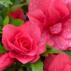 雨上がりの朝 八重咲きのサツキが綺麗に咲いています この位の開き具合だとバラのようにも見えます 今年はたくさん咲きそうです💗