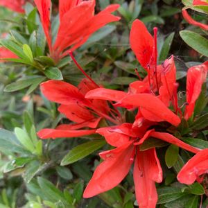 近場散歩🐶 我が家にもあるような白ピンクのサツキ?ツツジ?の横で 情熱的な赤! ワォ😍🎵でした。 追記 にゃんこさん関係から恐らく 皐月の「サンゴサイ」「キンサイ」 古くからある園芸品種らしいです。 区別は 5枚切れ込み花弁:珊瑚采(五弁金采、トンボ采) 10枚以上切れ込み花弁:金采