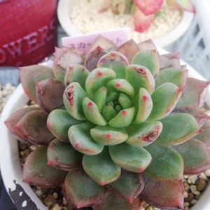 爪の先っちょ 赤くなって可愛くなってきたスカーレットさん💕ウォーターマークも綺麗〜ぽっ(〃▽〃)♡ 多肉ラボ©︎お題「今年の抱負」 ❀この前の寒波で弱った子を元の可愛い姿になるようにお世話する ❀ベランダの棚の綺麗に整理して置き場の確保する