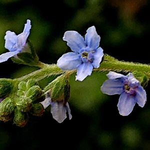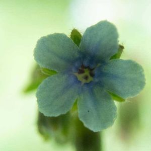 大瑠璃草(オオルリソウ) ムラサキ科オオルリソウ属の2年草。山地に生える。茎は高さ60〜90㎝になり、1㎜以下の圧毛がある。葉は互生し、広披針形で長さ10〜15㎝。花期は7~9月。花序は長さ10〜20㎝になり、やや密に花をつける。花冠は直径4㎜ほどで淡青紫色。花冠は先が5裂し、筒部の上端に鱗片状の付属体がある。果実は4個の分果からなり、やや平たく、刺を密生する。 出典『山に咲く花』