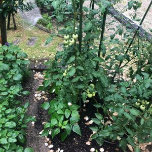 ミニトマトなのか中玉のトマトなのか、わからないのですが、桃子ちゃんという品種のトマトです。果房にはだいたい5〜7個位づつ実がなっています。色付くにはもう少しかかりそうです。隣で大きく育ちすぎたやまぼうしの花が満開ののち、雨とともに花びら散りすぎー。晴れたら片付けよう😊