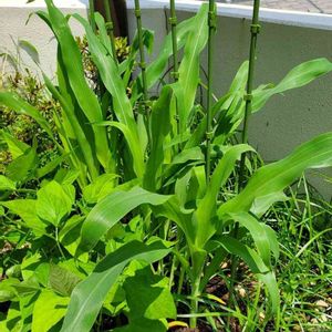 お祭りが始まりそうな ちいこいお庭です💧 つるなしいんげんは 前回よりも大きくなりまくり もろこしたろーも かなりデカい(--;) ワキに植えたネギさんは 存在すらわからないくらい負けてる💧 元気がありすぎて、手に負えないかもしれないですだ(--;)