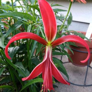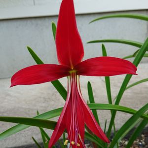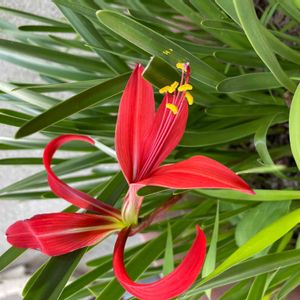 おはようございます🤗 玄関でいきなり出現した真っ赤なお花❣️ 赤い葉?と思っていたらあっという間に伸びて開花していました😍 スプレケリアまたの名前をツバメの形に似ていることからツバメ水仙というようです💕