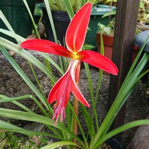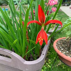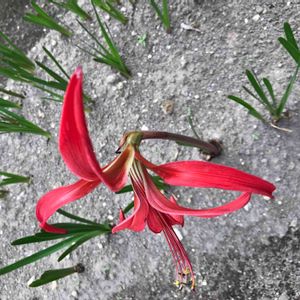 何の球根を植えたんだったかなあと忘れていたのですが、この花姿を見て、何かに見えませんか⁉️ 和名 ツバメズイセンと呼ばれている🌼スプレケリア🌼と言うお花でした✋ 飛んでいるツバメを思わせる花姿がユニークですよね😊 真っ赤な色もインパクトがあります💓