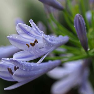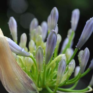 ❝ アガパンサス ❞ ❛ 雨の中、花弁の内側中心寄りの大きな雫の中には気泡が入っています! ❜ こんばんは! コロナウィルス感染、気を緩めずに!。。。ですね、もうちょっと。。。油断大敵! ❝おうち❞/マイガーデンのアガパンサスです! 昨年の9月7日に名札無しで葉っぱが綺麗だったのできっとお花も綺麗だろうって想像して、お迎え&投稿して、ユーザーさんに名前を教えて頂いたポット苗から2本の花穂が伸びています。この写真はそのうちの一つの一部分です。1本の花穂の先の大きな蕾のような袋が割れて、本当の蕾がたくさん入っていて半分くらいが咲いています。 雨の中、透明ビニール傘をさしての撮影ですが、レンズとカメラボディーは防滴仕様ですが、雨はどうしても当たるので、もとより気合も続かないので数分間で切り上げています。防滴仕様でないとカメラカバー無しではカメラ機材には危険な撮影です。この際、カメラカバーを買おうかなぁ? 撮影後はタオルで先ずは拭き拭きです。。。 フルサイズ・ミラーレス一眼と使用したレンズはタグ付けした100mmの等倍マクロレンズですが、更に大きく撮るためにEOS Rのクロップ1.6倍機能をONにして、APS-Cサイズカメラと同じような焦点距離160mm相当で撮影しています。この場合、APS-Cセンサーカメラにこのレンズを装着した場合と比べて、このカメラでクロップ1.6倍機能をOFFにした通常の画素数の約1/3になります。同じ写真を撮るならAPS-Cの方が有利です。 短い時間ながら、撮影設定でいろんな工夫を試みています。 撮影日:2020年6月28日 朝 100mm(=実効)のマクロレンズでの撮影