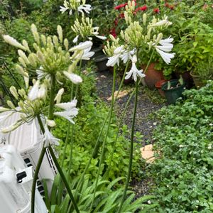 アガパンサス こちらは普通のアガパンサスの白🤍 3年目だったかな?小さな苗でしたが、今では薄紫色のアガパンサスと同じサイズになりました。 花数は5本。毎年順調に増えています😊