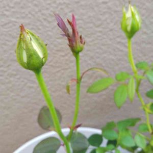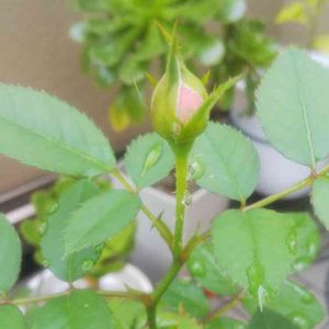 去年お迎えした100円のミニバラ🌹 最初のつぼみは中身がなくてポロッととれちゃったけど、2個目のつぼみはこんなに膨らんできました😁 ピンクが見えてるからもうすぐ咲きますね⤴️ 楽しみ~😆
