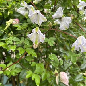 バラが終わって静かになった庭に似合うクレマチス、アルバラグジュリアンス🌱 爽やかで上品なお花とは裏腹に蔓はよく伸びてオベリスクだけでは収まらず、いつも奔放にいろんなところまで行っちゃうたくましさがあります😊