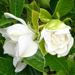 8月17日 今日のお花 💚🤍🤍🌿クチナシ🌿🤍🤍💚 クチナシの別名には、梔子(くちなし、しし)、山梔子(さんしし)、センプク、ガーデニアなどがあります。 クチナシの一重咲きと八重咲きと実です。 花期 6〜7月 花は花弁が5〜7枚に裂け、雌しべはこん棒のように太くて長く、雄しべは垂れ下がっている。葉はつやがあり、葉脈部分は深くくぼんでいる。果実は楕円形で、先端にがく片がツノのように残っている特徴的な形。食品の色付けや染料などに使われる。果実が熟しても開かないことから、「口無し」の意味で和名がつけられたとされる。初夏に芳香のある白い花を咲かせ、秋にオレンジ色の実をつける。 三大芳香花の一つです。あとの2つはジンチョウゲとキンモクセイです。 🏷️日曜日は日本を感じる和の花 🏷️素敵な日曜日を✨️ 🏷️白輝美人 🏷️白い貴婦人✨️