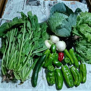 新鮮野菜のオンパレードです。 我が家で収穫出来たのは ピーマン・きゅうり・ナス ご近所さんからのお裾分け。 立派なほうれん草・カブ・レタス・キャベツを頂きましたよ。 お夕飯の一品に、ほうれん草の卵とじを追加しました。