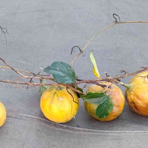 りんご園側のヤブの中に絡まった黄色い実を見つけました。 カラスウリとは違って 形が丸すぎます。 何でしょうか?