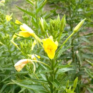メマツヨイグサがあちこちで花をつけています。 長雨で元気いっぱいです。