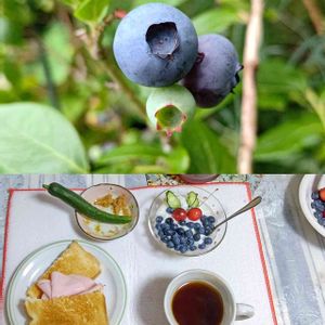 今朝の朝食は ハムとグリーンボールをはさんだトースト 採りたてきゅうりとお味噌 ヨーグルトにブルーベリーとサクランボときゅうりの輪切りのトッピング コーヒーでした。 簡単メニューですよ。 採りたては、何でも美味しいです。