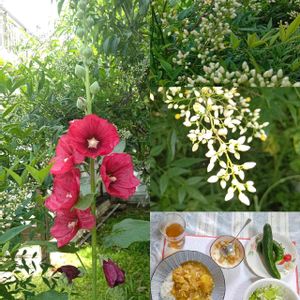 昨夜は風呂桶をひっくり返したほどの大雨とカミナリでした。 夜間なのに稲光⚡で 一瞬明るくなる程でとても怖い思いをしましたが 何と現在は青空です。 一雨来るほどに草花の成長はとても早い気がしています。 南天の花とタチアオイ 満開になりました💮 お昼は、昨日の夕飯カレー🍛の残りとサラダ 簡単です。 きゅうりもお味噌付けてまるかじり🥒 午後も少し頑張ろう🌱🌿☘️🍃