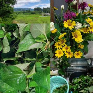 久しぶりの青空でした。☀ やはり太陽はありがたいです。 雨上がりは、草木がすこぶる元気なので あちこちワサワサと 伸びてきていました。 草刈機でキクイモモドキやドクダミも全て刈られていましたので 籠を持って拾い集めて来ました。 ドクダミはしっかり洗って 影干しします。 キクイモモドキの花は、タイマツバナと一緒に花瓶に入れました。