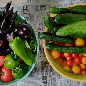 本日の収穫です。 今年のきゅうり出来が今一つ悪いけれど 自宅で食べるのには 形も気にしないので良いですよ。 地産地消 新鮮が一番です。