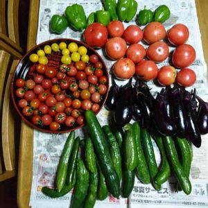 今朝の収穫 梅雨の長雨で キュウリの葉が 傷んで きました😢 後1~2回の収穫で 今年は おわりかな? ナスとトマトとビーマンは まだまだ 採れそうです😁