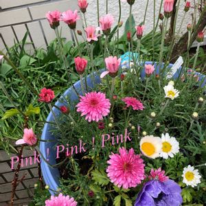 おはようございます😃/ 過去の写真からです。 春の寄せ植え❣️ ローダンセマム、マーガレット、アネモネ 殆どPink Pinl Pink ❣️ ピンク色でいっぱいだよー また春に咲きますように^_^💜💓
