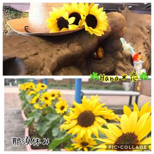 那須休み5 黄色が可愛い、ひまわり🌻がたくさん咲いてました😁 アトラクションの恐竜🦖もオシャレしてました😁🌻✨✨