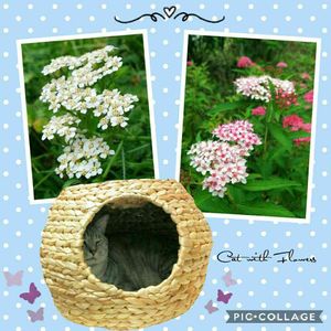 ❀ 花と猫 ❀ 最近出会った小花たち 🌼.* ㊧ セイヨウノコギリソウ(ハーブのヤロウ) ㊨ シモツケ …で合ってますかね~( ´•ᴗ•ก)💦 とっても可愛く咲いていました😊 ごまくん🐈は 猫ちぐらでお休み中💕