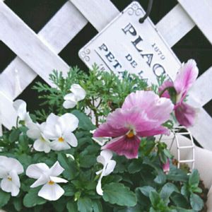 ピンクのパンジー & ホワイトのビオラ 旦那さんがどこからか頂いてきました😊 黒ポットのまま ほったらかしだったので見かねてプランターに植えてみたら「あら💞なんか可愛い〜💕🤗」
